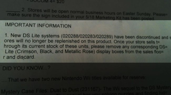 La noticia es bien clara, aunque Nintendo no lo haya confirmado todavía, puesto que es un rumor, la DS Lite podria dejar de fabricarse. Aquí un pequeño párrafo extraido de la cadena GameStop